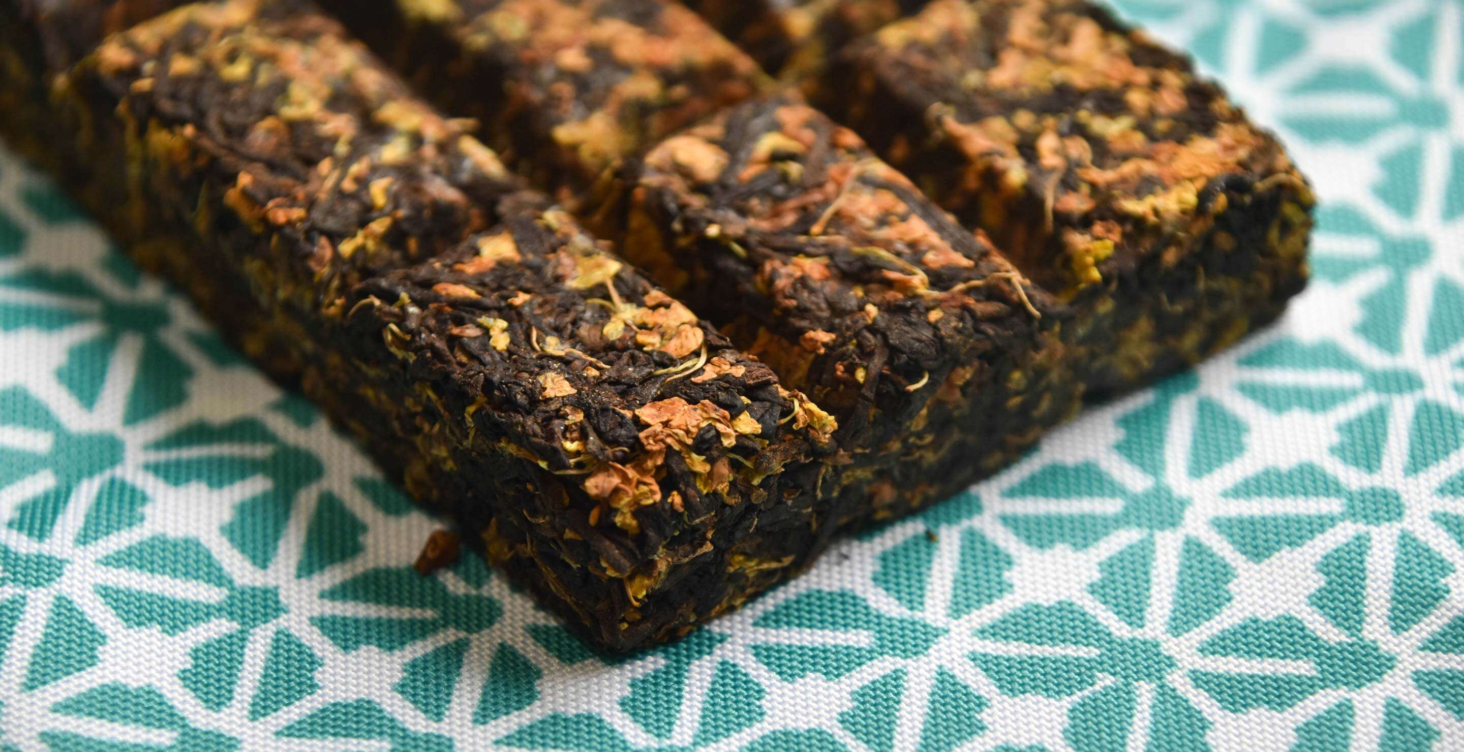 Golden Osmanthus flowers give this clean, rich shu pu'er a dessert-like quality. This tea is part of Xingyang's new series of pressing fruits and flowers used in traditional Chinese medicine with their carefully blended shu pu'er. The chocolate bar shaped brick is scored for perfect portions on every brew.