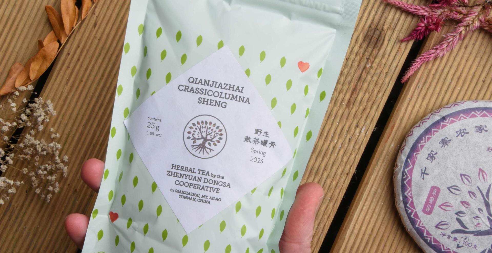 This tea is sustainably wild-foraged from ancient Camellia Crassicolumna (厚轴茶) tree, a close relative of tea native to Qianjiazhai. Crassicolumna is naturally caffeine-free and rich in antioxidants. The giant leaves and buds picked from this wild-growing tree stock are allowed to gently sun dry without any heat processing to keep the most natural flavor. Wild crassicolumna trees can be anywhere between several hundred and over a thousand years old, and are incredibly tall and difficult to climb to harvest these precious leaves, but the rich nuanced flavor and lingering aftertaste is worth the effort.
