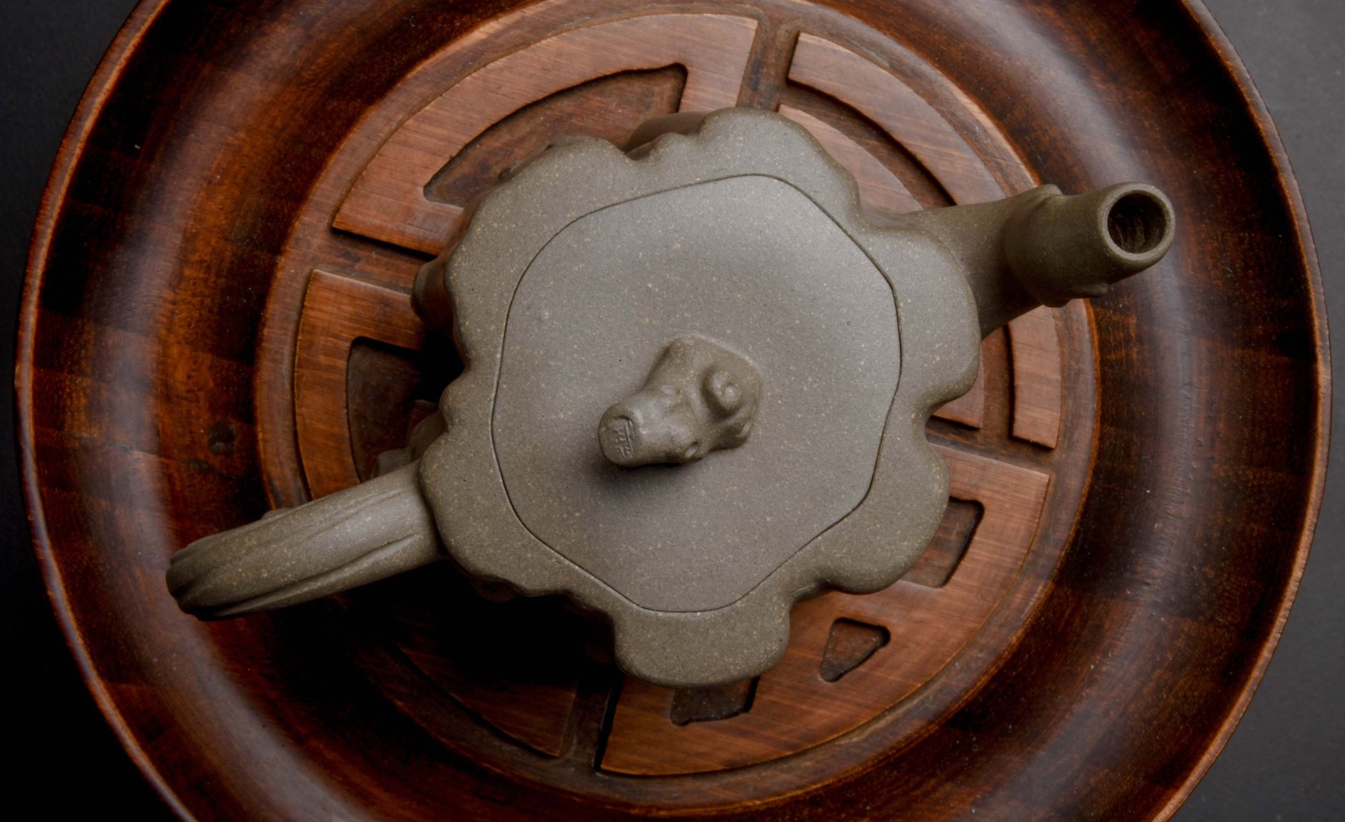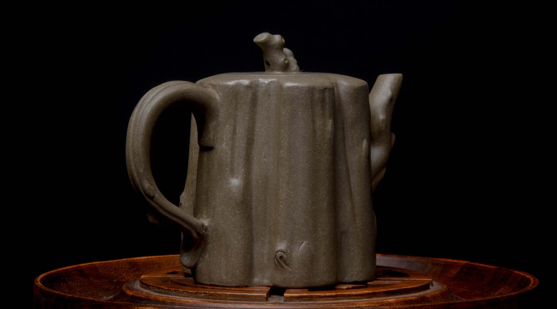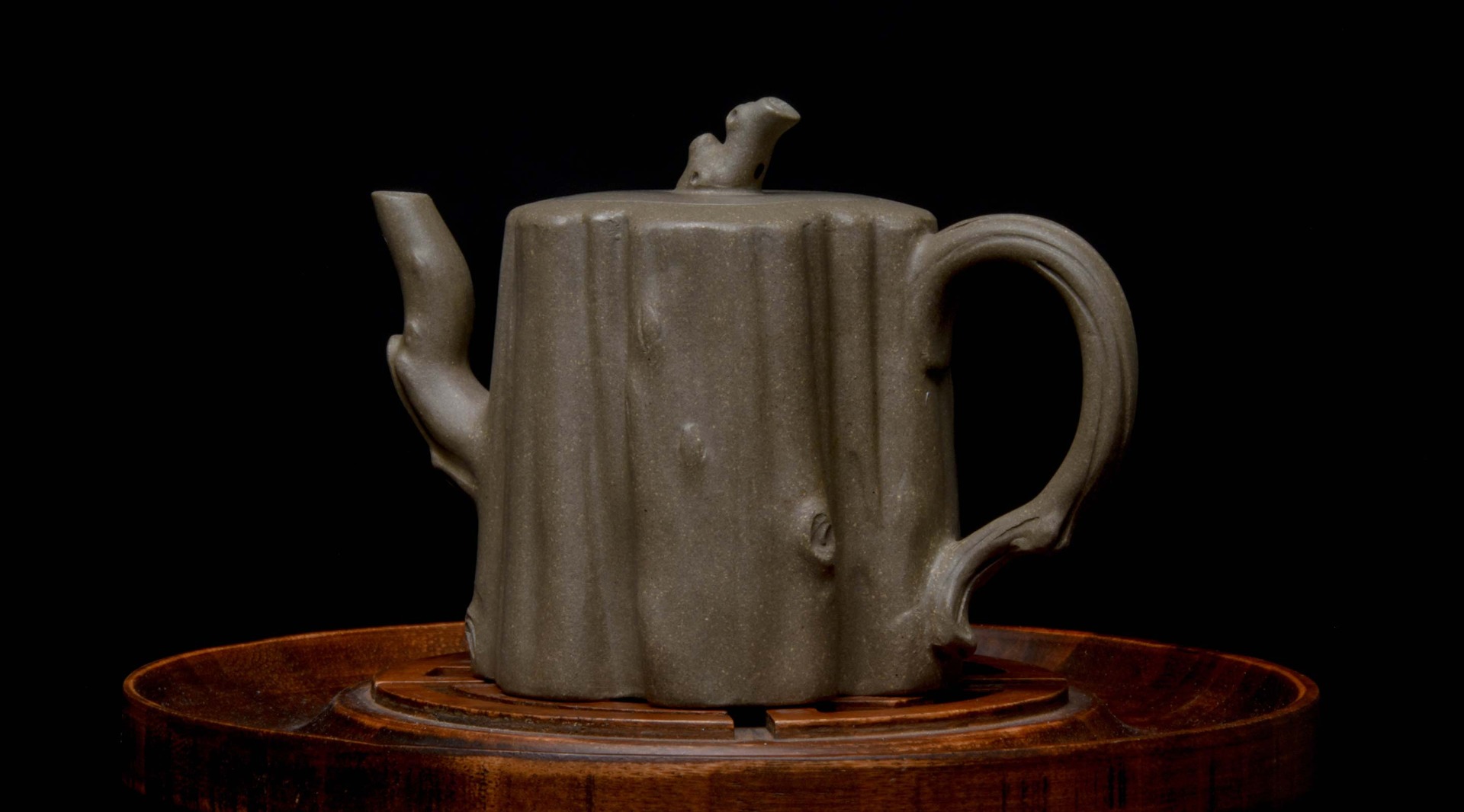 Qiu Lin or “Contemplating Autumn” is a bold and striking study of the shapes a tree can form, the ripple and channels in the bark, the burls that tell the tree’s story. Lai Xiaohong carves these deep channels in meticulous detail to show off the beauty of trees sweeping twisting shapes in the autumn as leaves begin to fall. The gnarled lid handle and spout show off the age and history of the tree this pot is a tribute to.