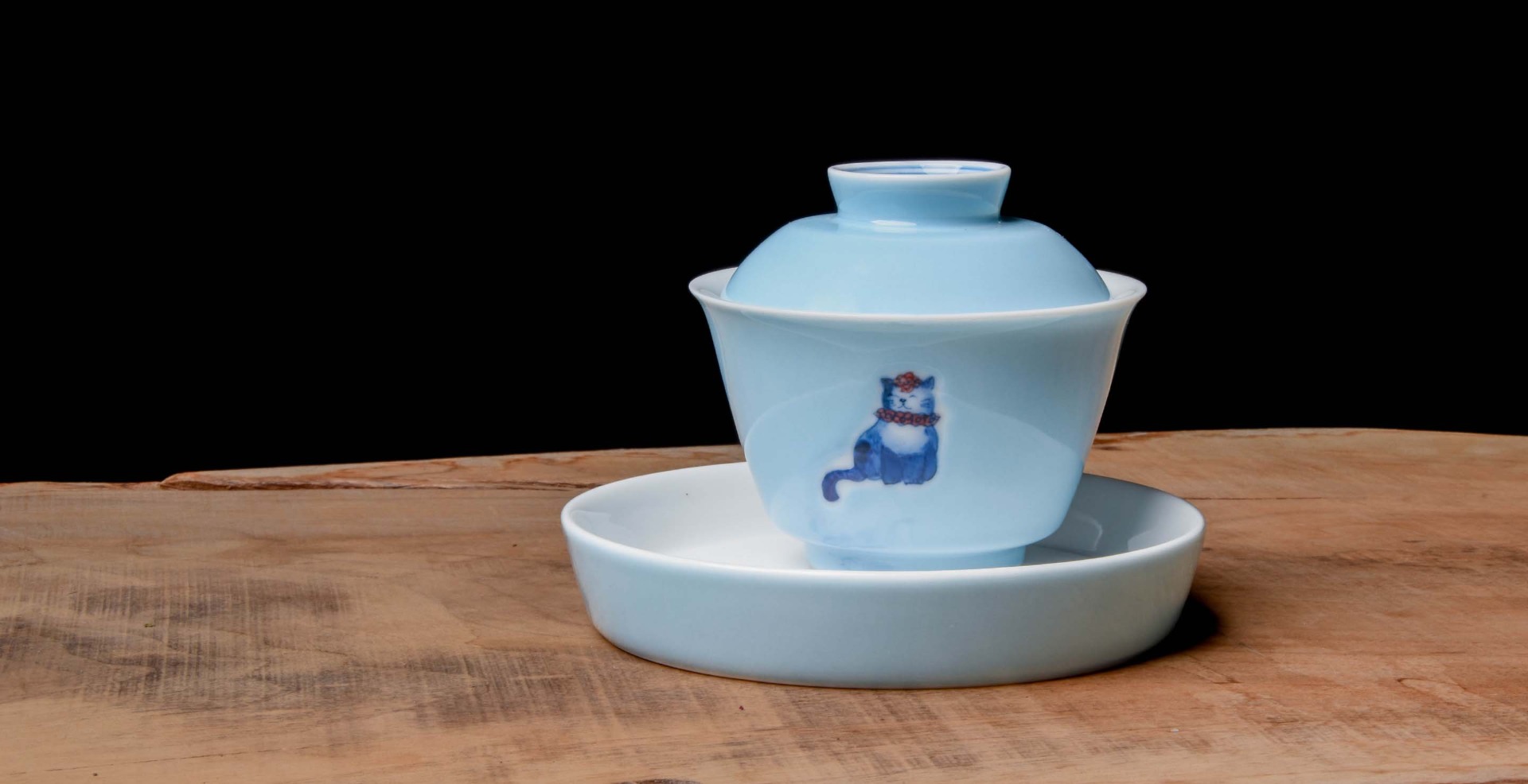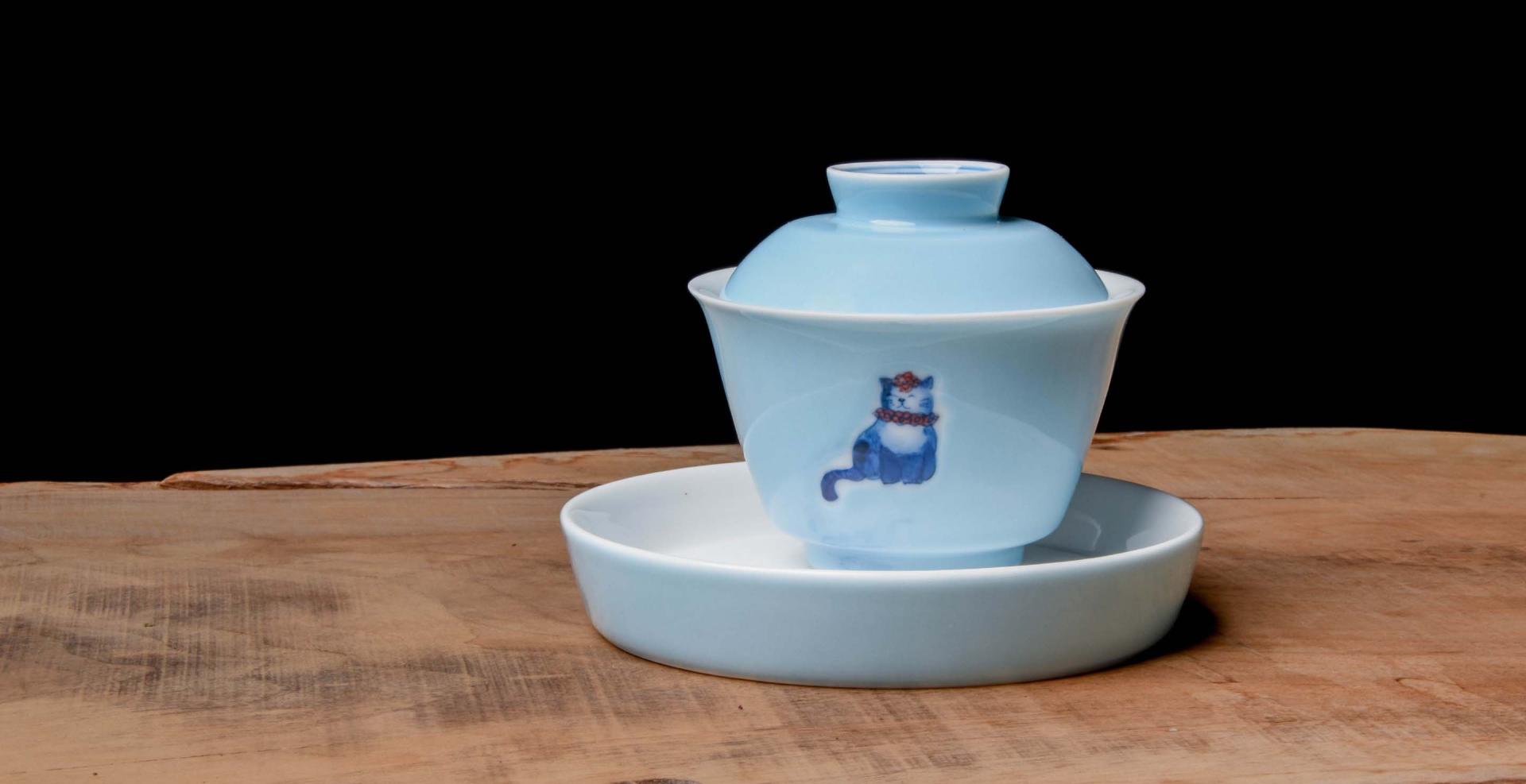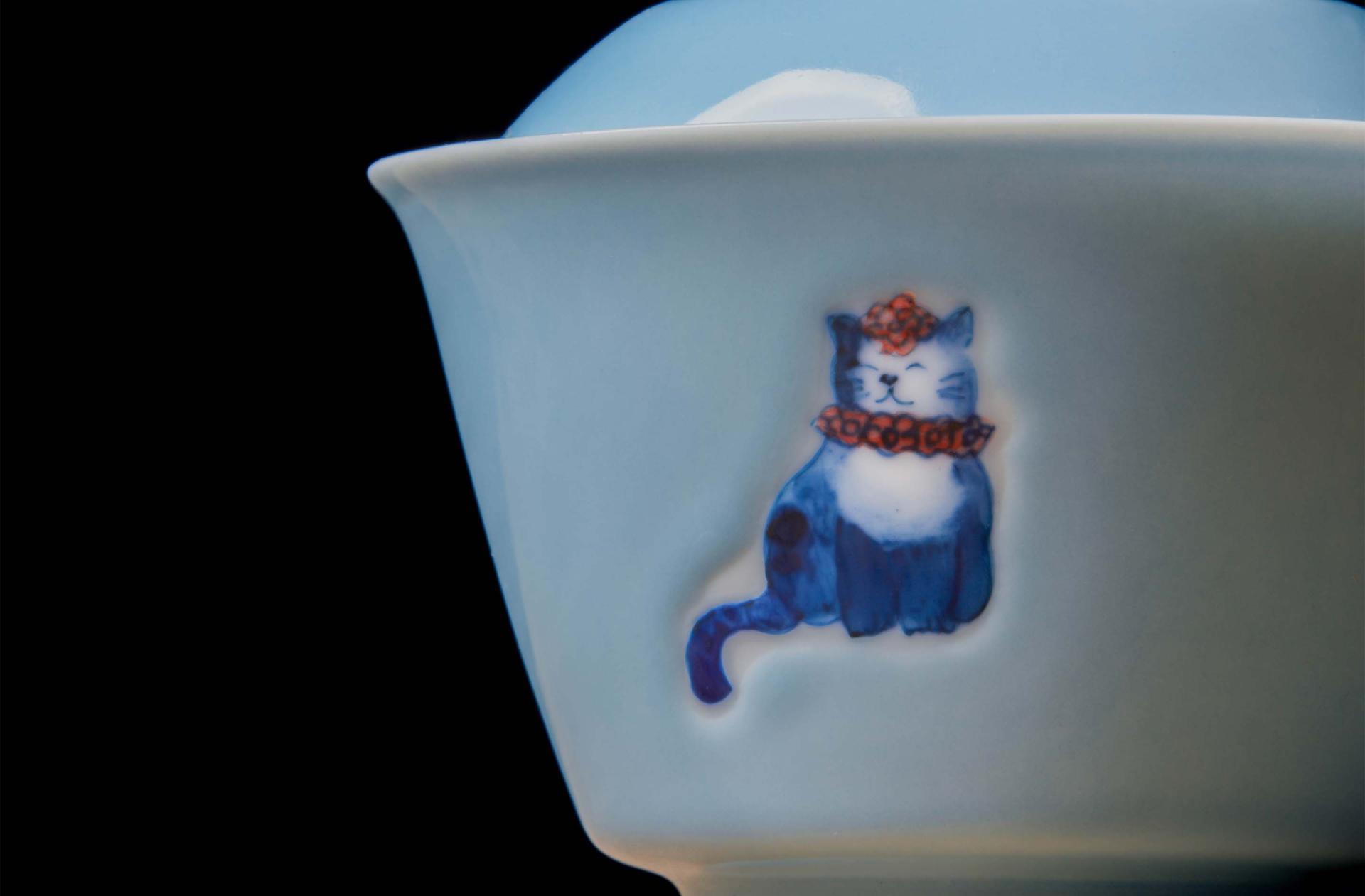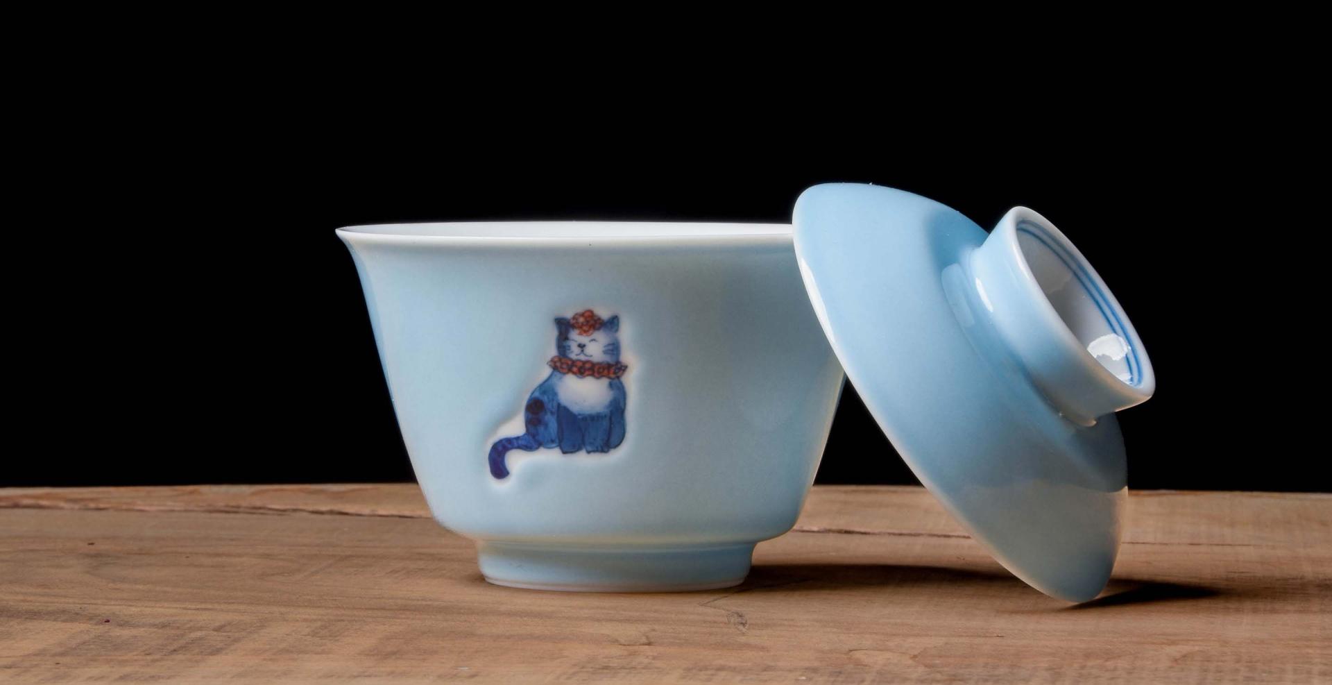 Peng Yuan Qing Hua studio takes their cat theme seriously, depicting the cats on this gaiwan + saucer set with the same level of detail and gestural beauty that they would put into a traditional landscape or floral motif.