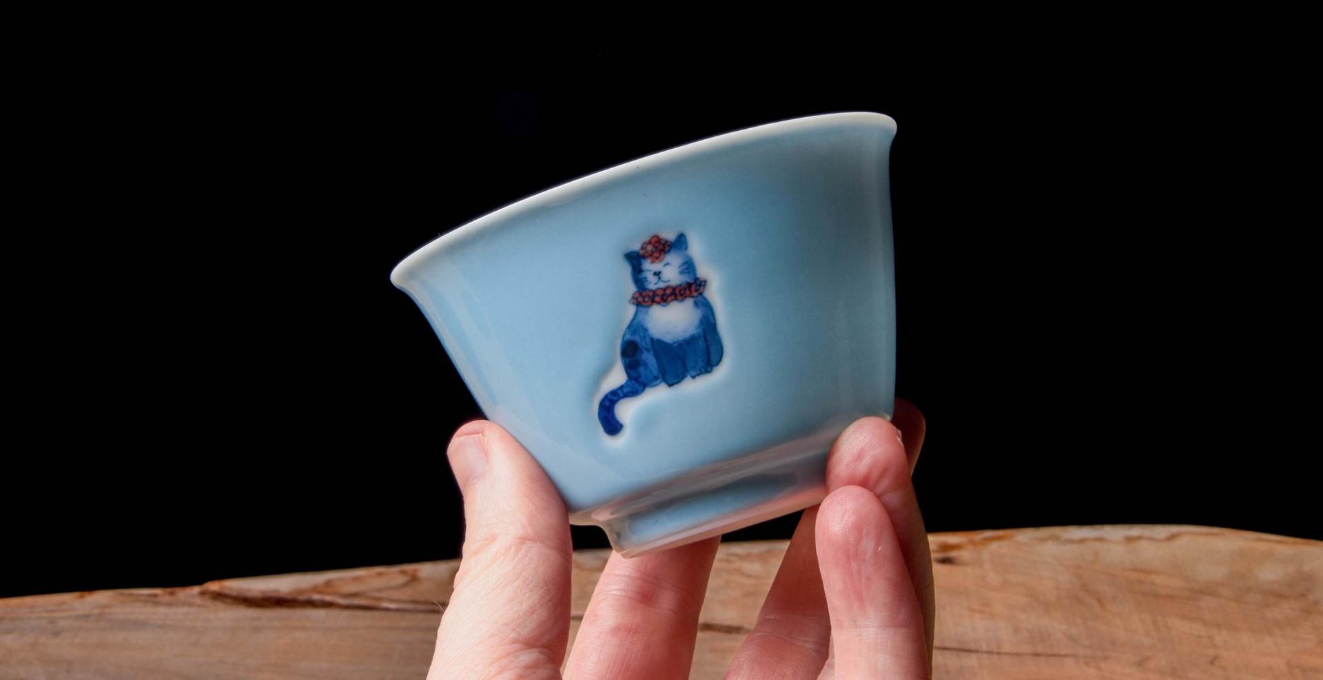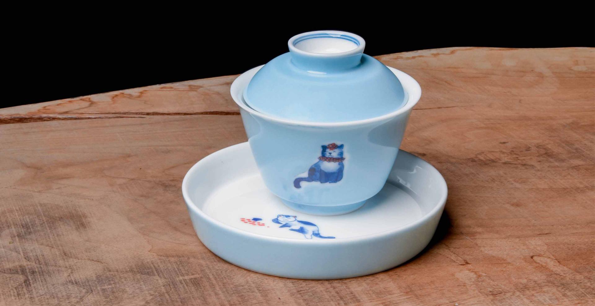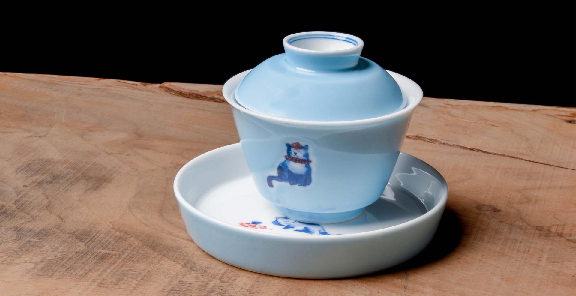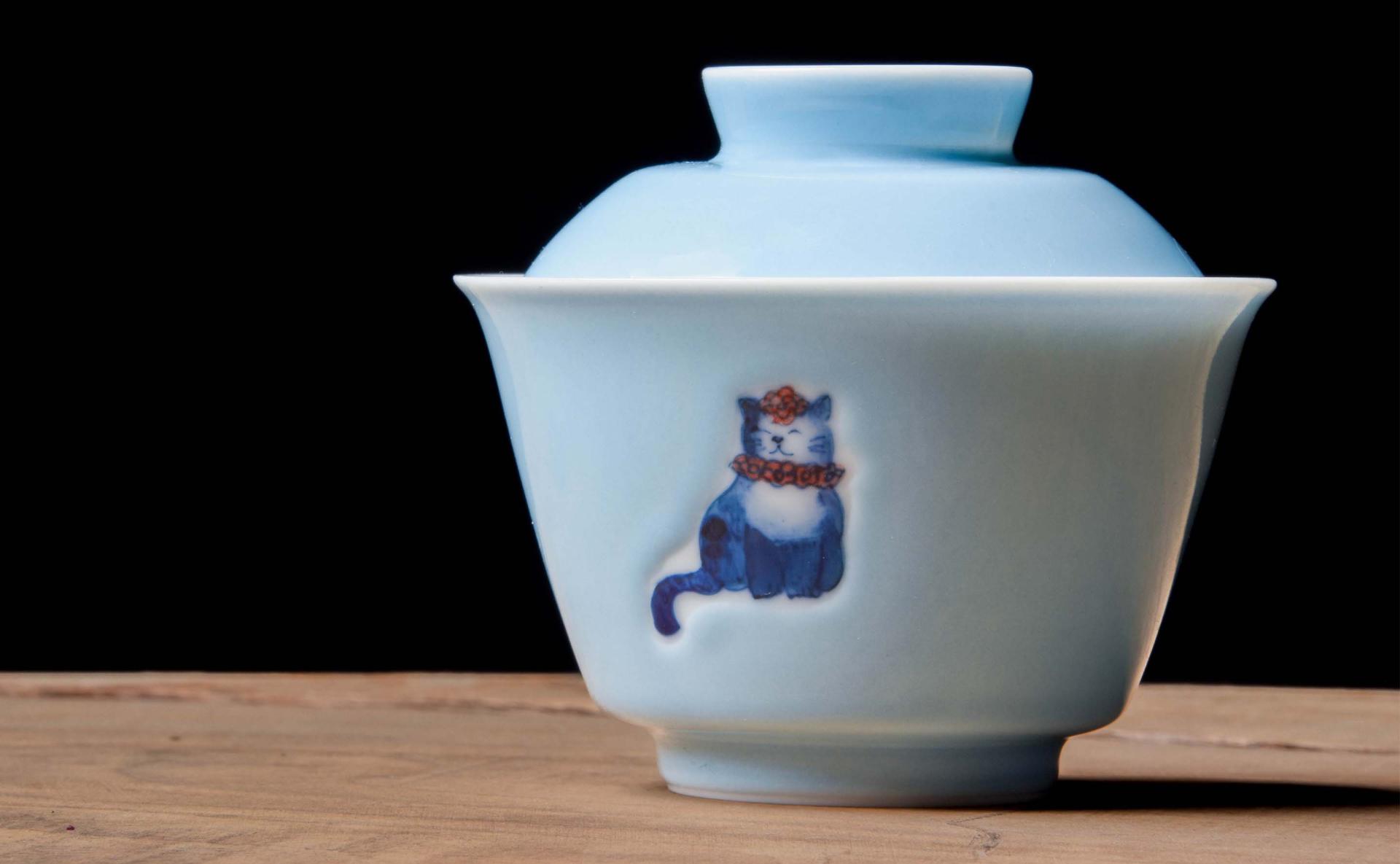 Peng Yuan Qing Hua studio takes their cat theme seriously, depicting the cats on this gaiwan + saucer set with the same level of detail and gestural beauty that they would put into a traditional landscape or floral motif.
