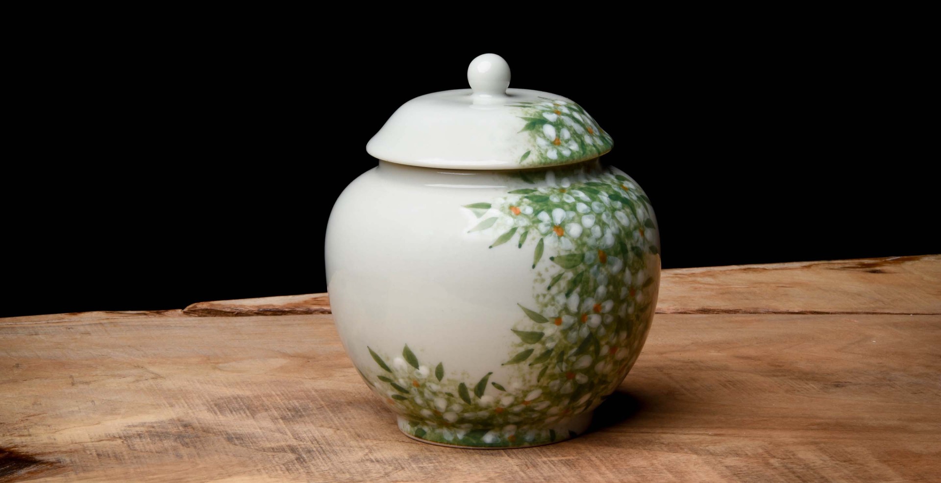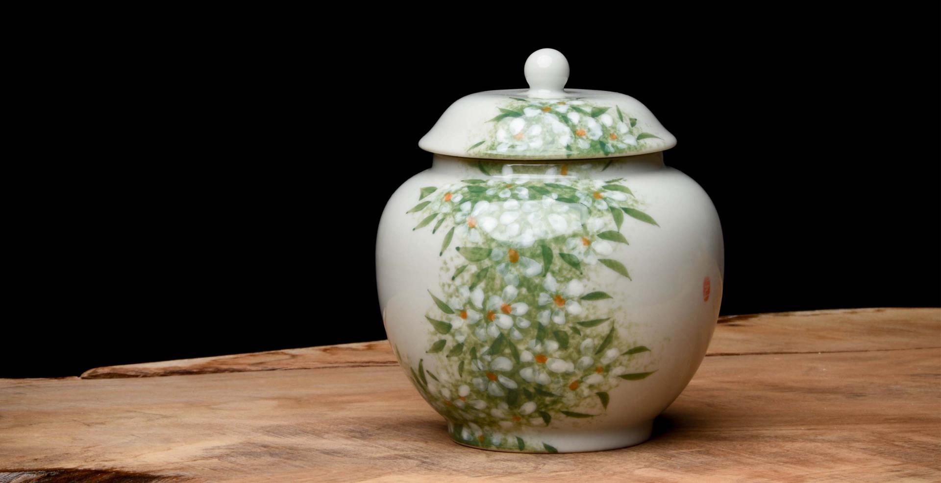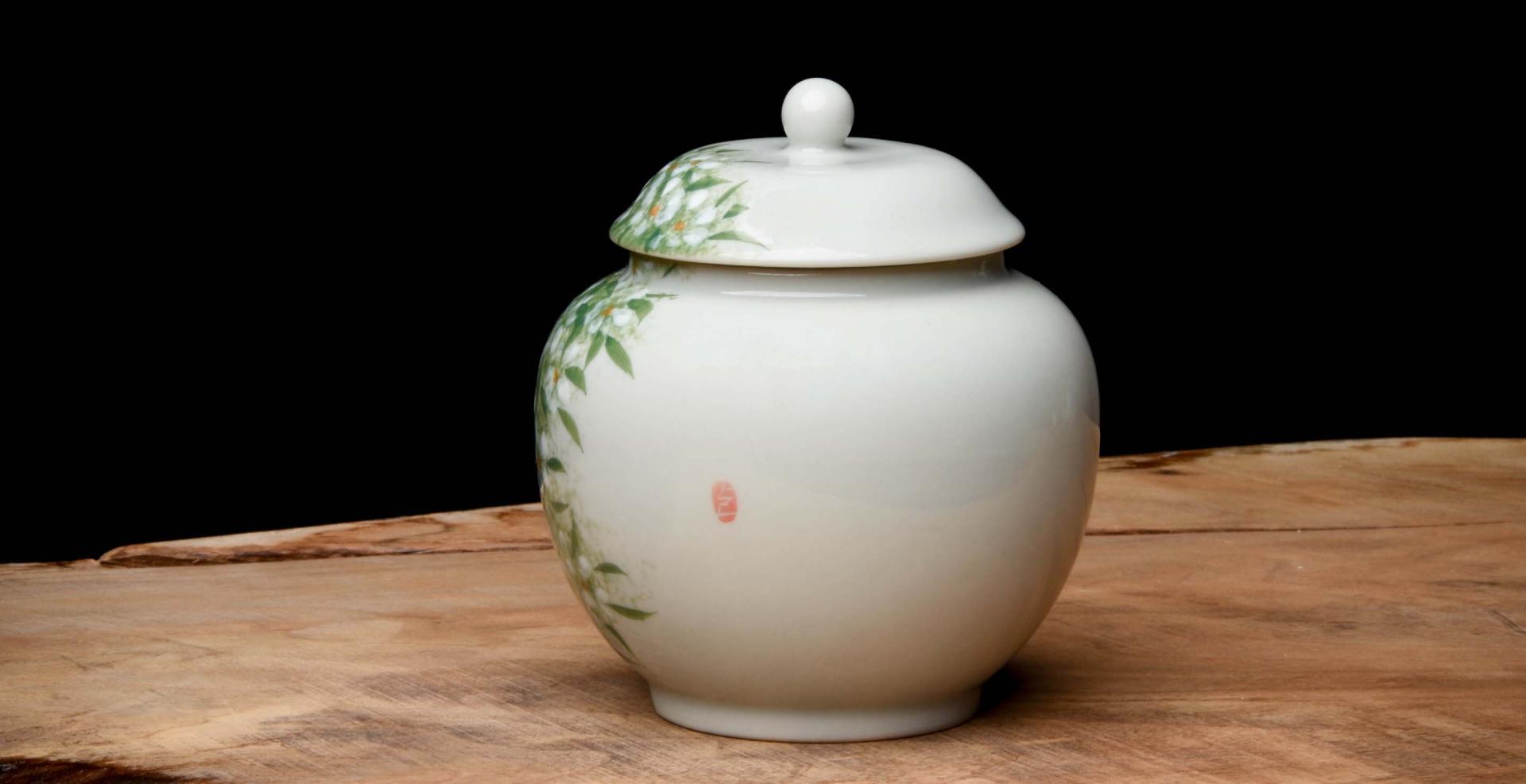 The adorable daisies adorning this tea caddy against rich warm grey evoke a vintage 1960’s style with lush rich brushstrokes and deep greens. The Peng Yuan Qing Hua Studio shows off their mastery with such extensive hand painting work, against the backdrop of a high-fired, fully-vitrified tea caddy.