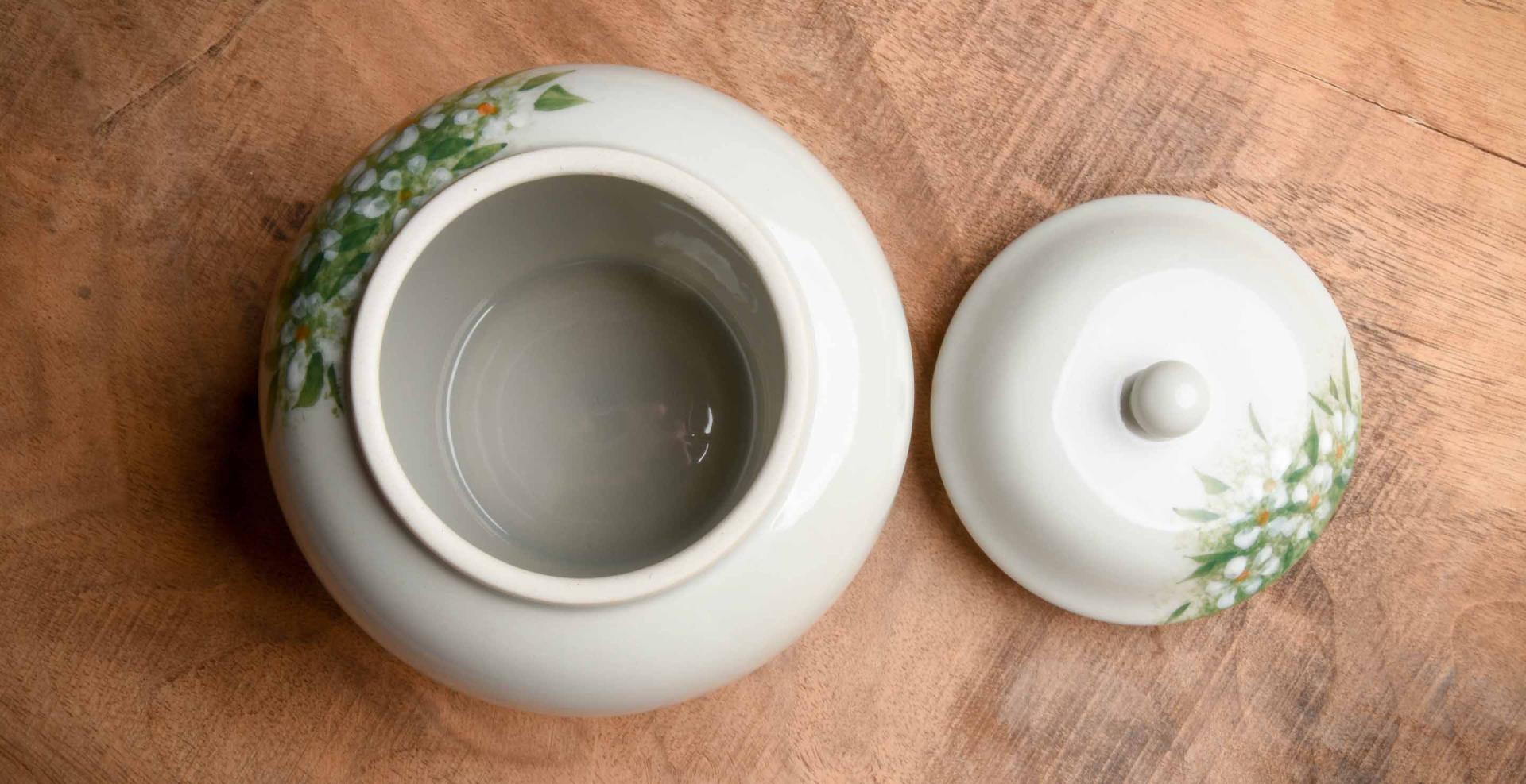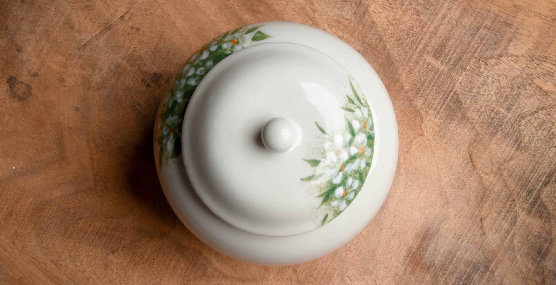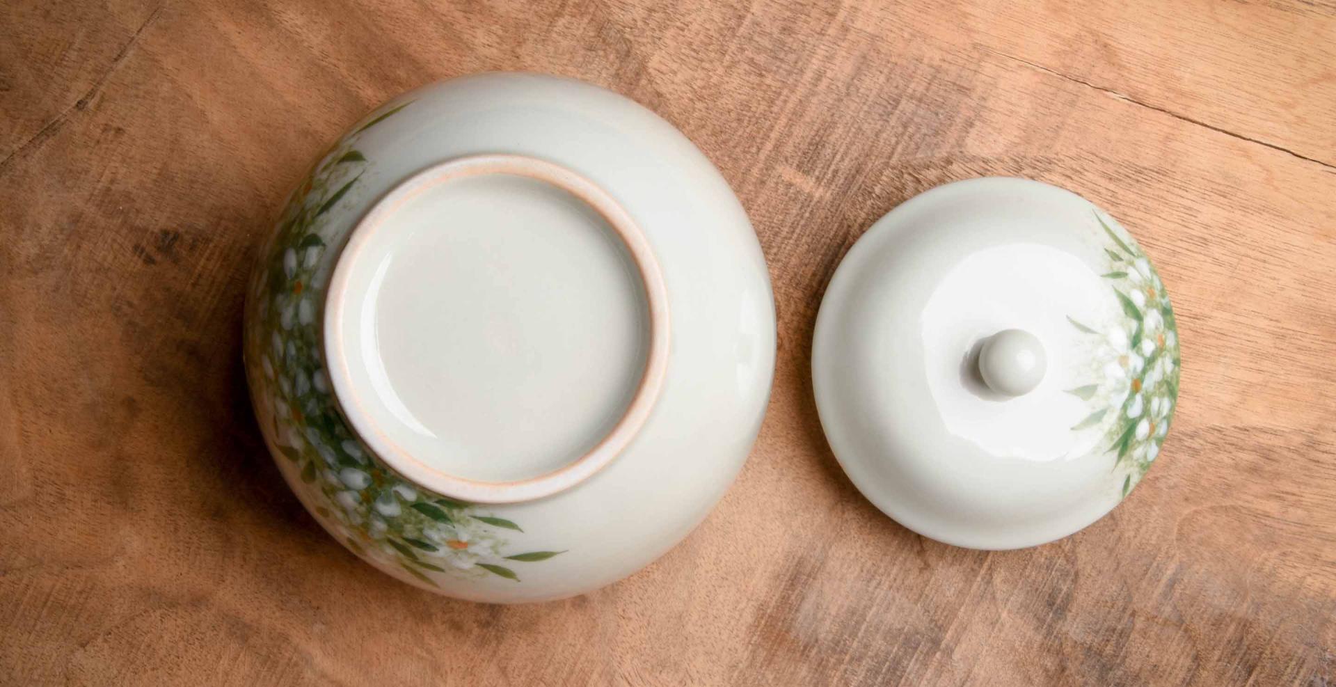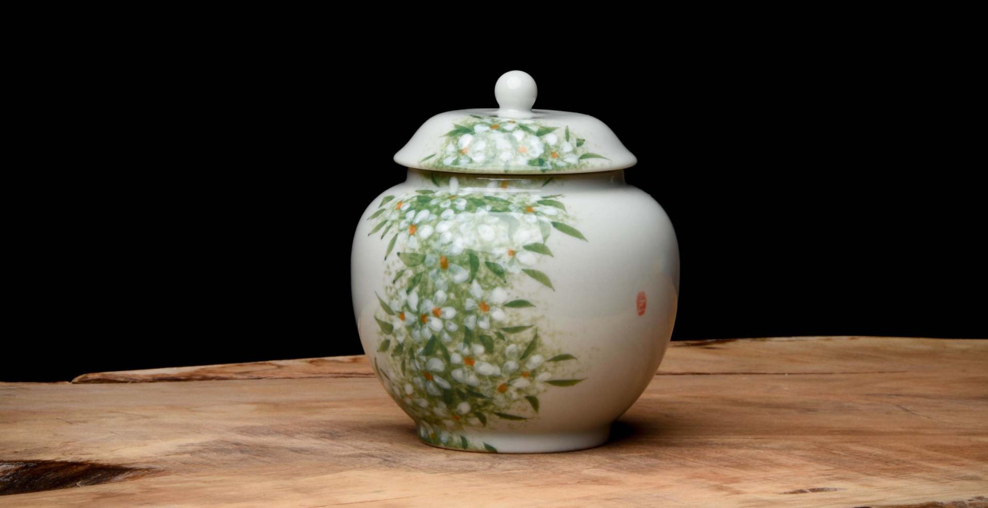 The adorable daisies adorning this tea caddy against rich warm grey evoke a vintage 1960’s style with lush rich brushstrokes and deep greens. The Peng Yuan Qing Hua Studio shows off their mastery with such extensive hand painting work, against the backdrop of a high-fired, fully-vitrified tea caddy.