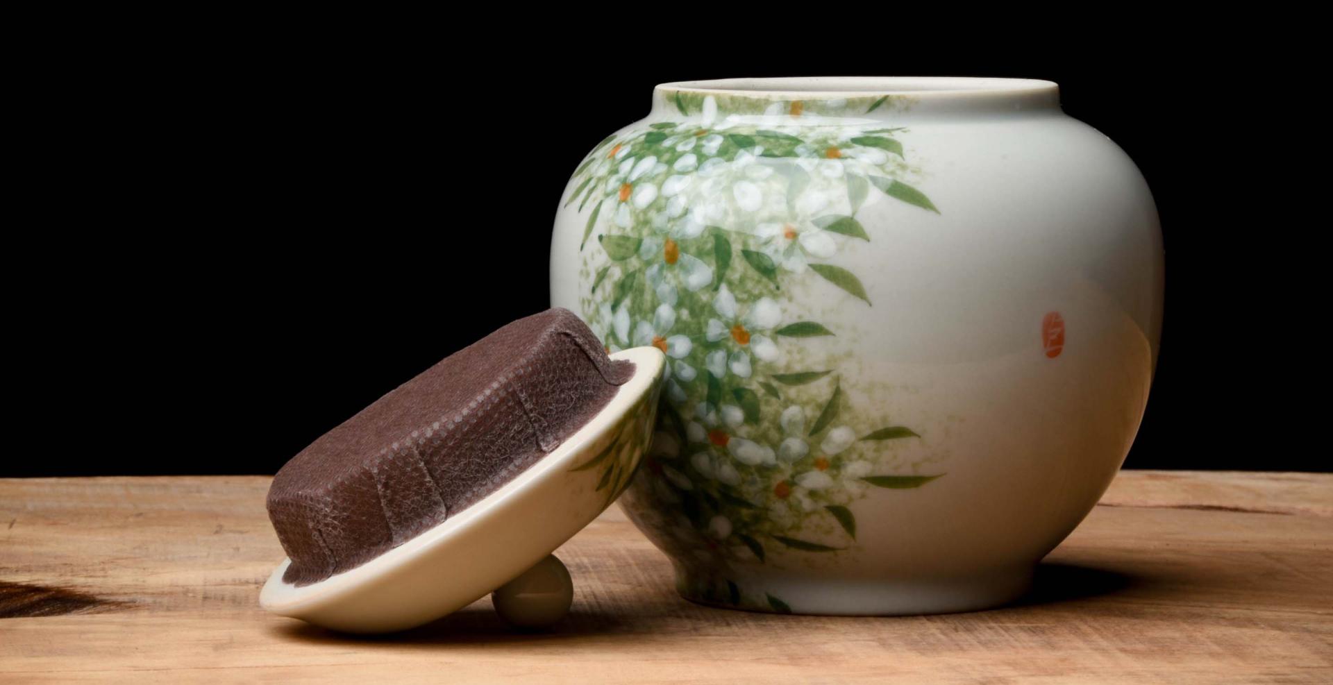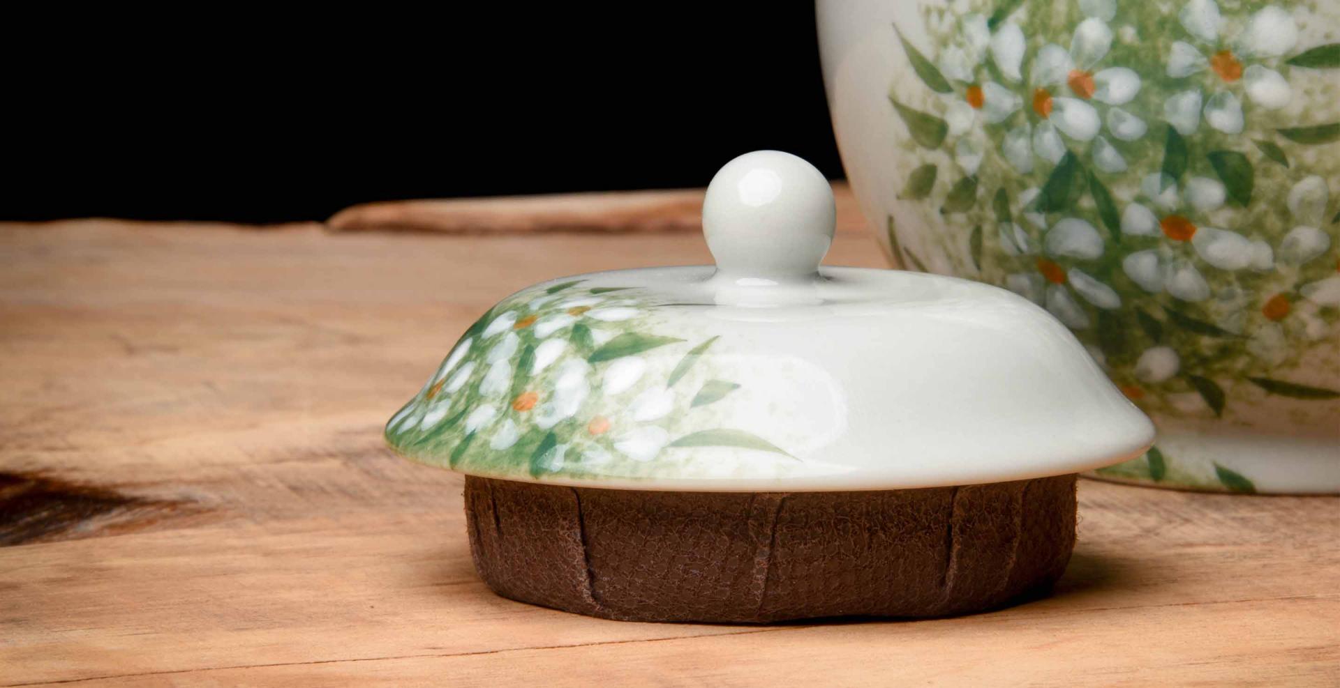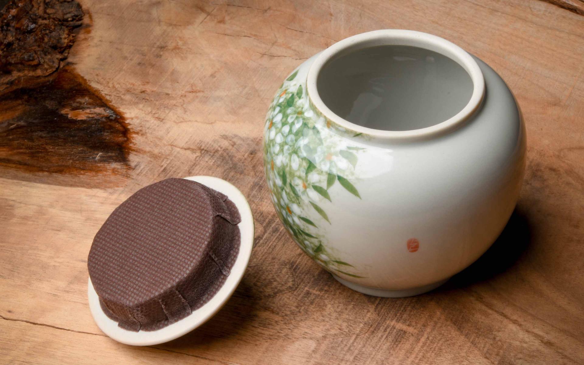 The lid of the caddy includes a wrapped stopper to limit airflow and protect the aroma of the tea.