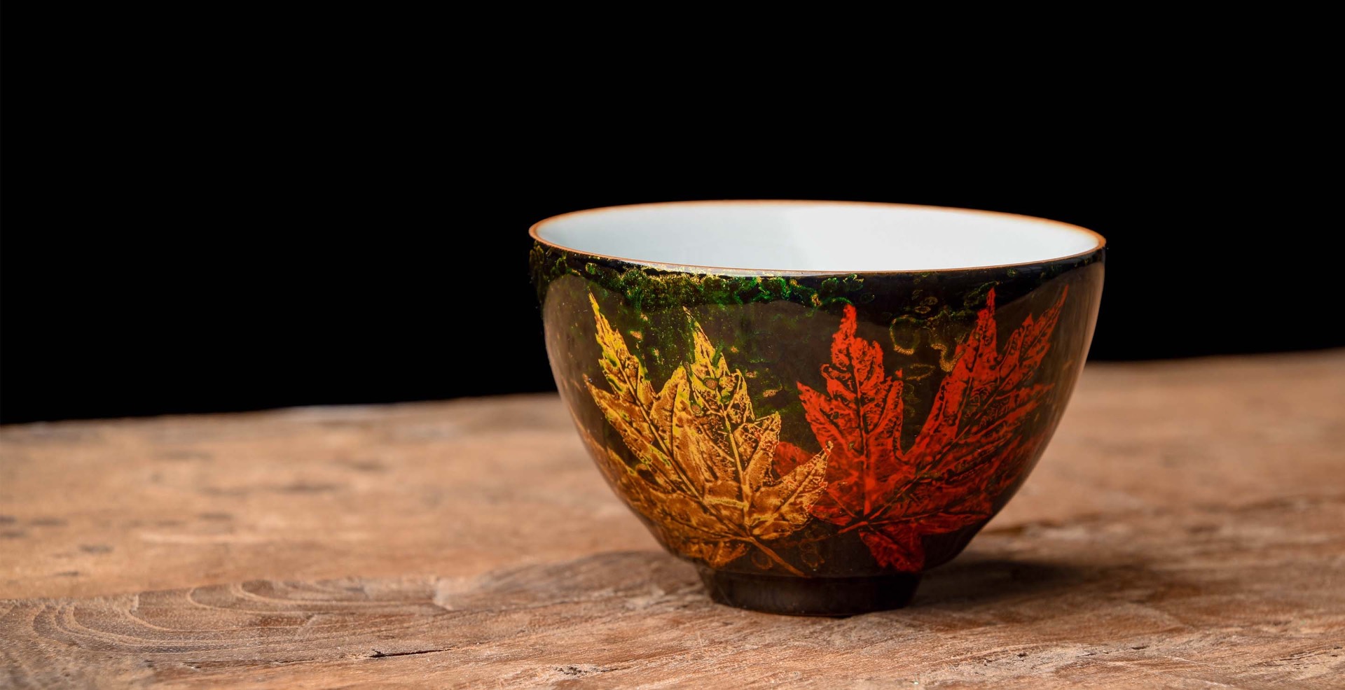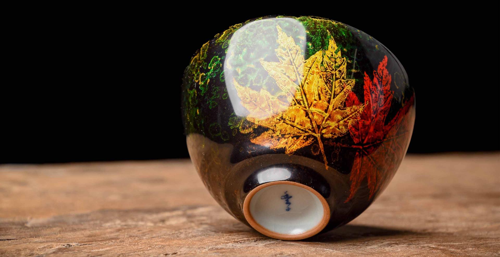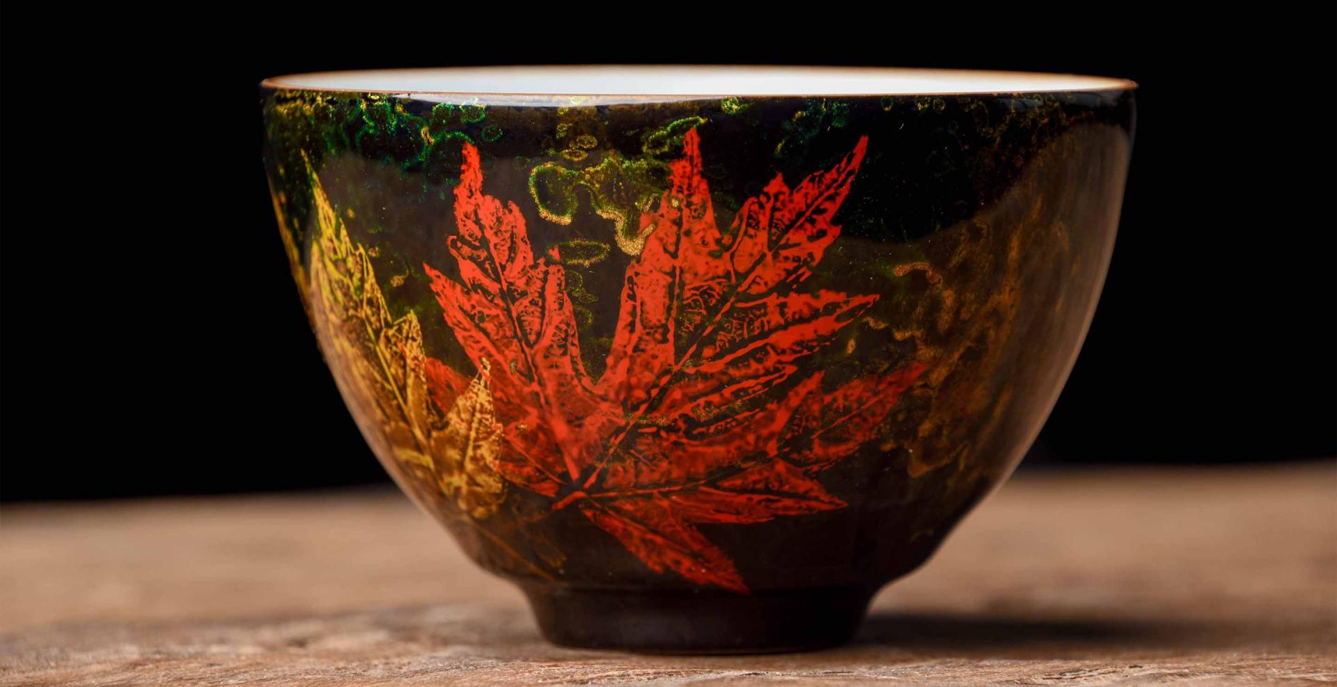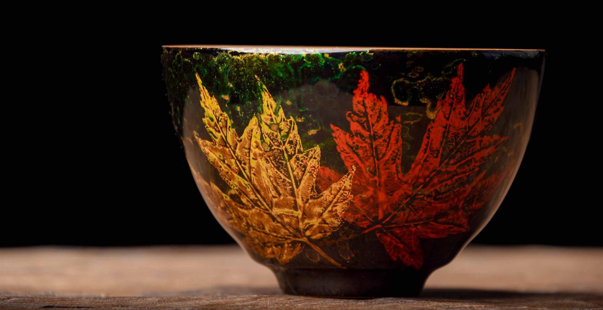 The lacquer layer is built up over many applications, creating a soft smooth feeling, and a beautiful contrasting color to the blue Ru glaze. The brilliant maple leaf imprints against deep swirling greens is a nod to the Song Dynasty Jizhou leaf imprint ceramics tradition.