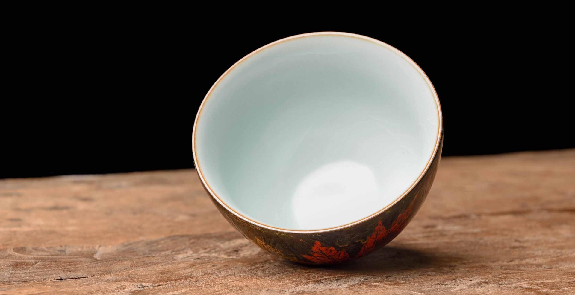 While the oldest lacquer wares are made from turned and carved wood, dipped in countless layers of resin, the problem in bringing this ancient craft into tea culture is lacquer’s dislike of boiling water. Feng Zi Studio takes up the challenge, by making the cup material their stunning Ru, leaving the inside lacquer-free so that the cup can withstand generations of use.