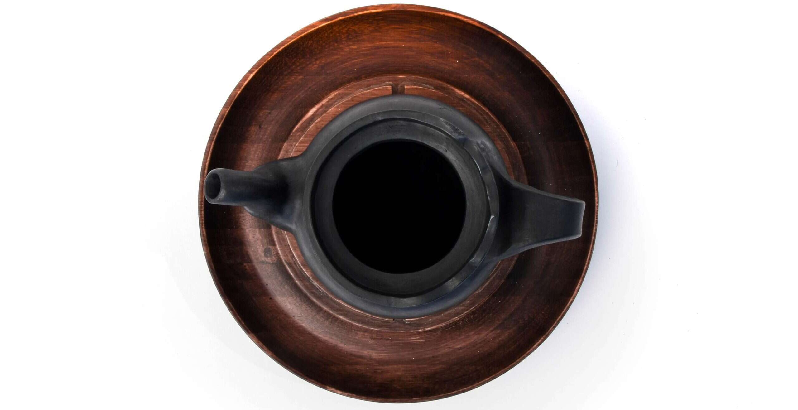 This incredible little teapot was hand-built and traditionally fired by master Dangzhen Pichu in Nixi village, the home to one of the oldest pottery traditions in Tibet. This piece is formally situated between a modern gongfu style and the ancient Tibetan yak butter brewing pot form, incorporating Dangzhen Pichu’s research in Yixing with his mastery of the Nixi style, evident from the decorative crested top and gestural carving. he silver sweeping across the form is a rare effect of firing called yaobian that is highly sought after because it can only occur through chance during traditional bonfire firing. The interior of the pot is rough-hewn, leaving intentional indentations to show the role of the artist. This piece will absorb the flavor and aroma of tea over time and build a beautiful patina like Yixing, and has been hand-signed on the bottom by master Dingzhen Pichu.