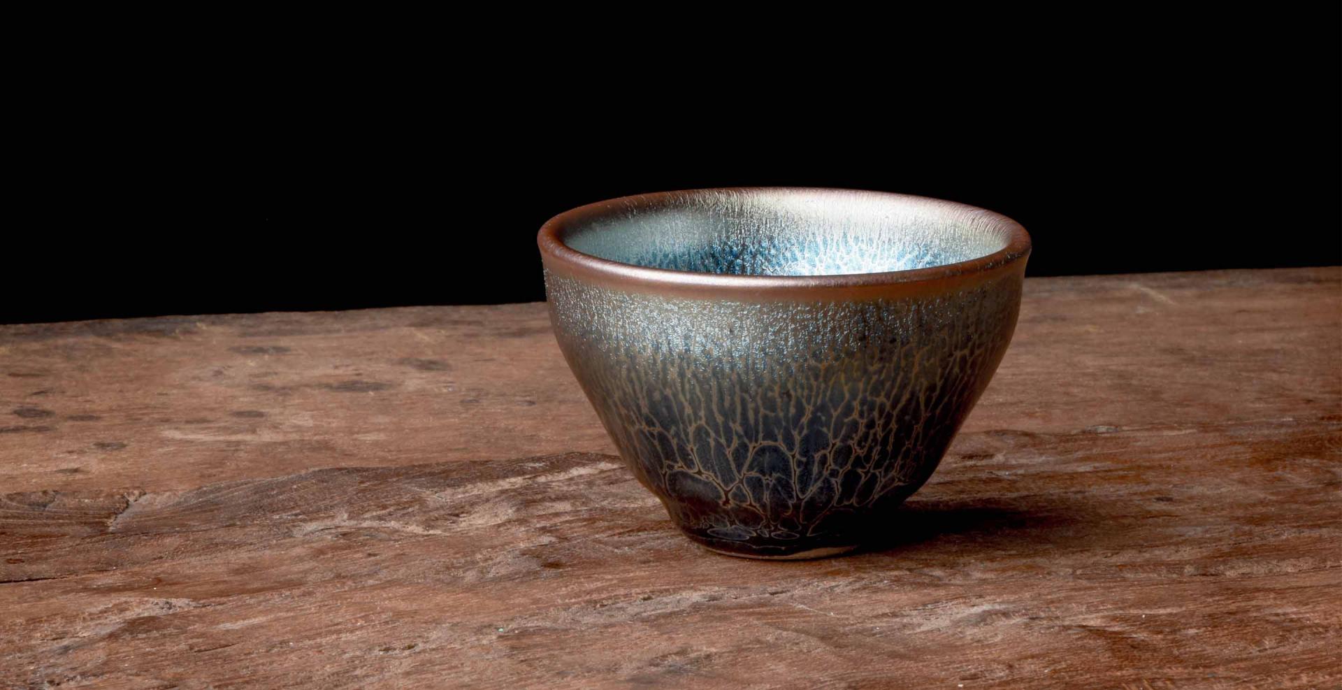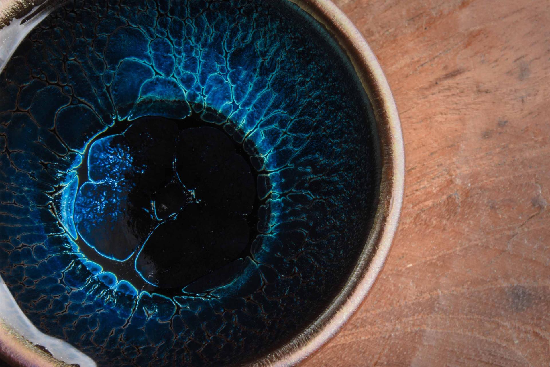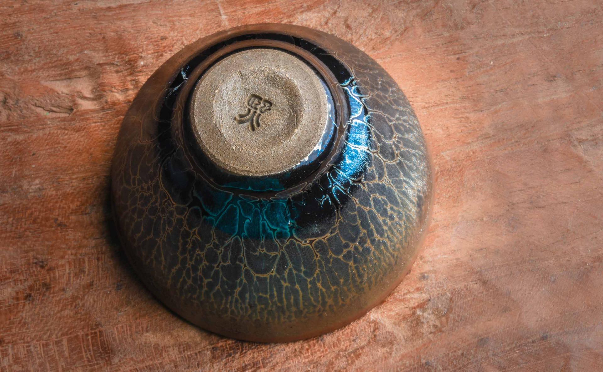This beautiful shimmering blue gongfu teacup is the result of years of research and experimentation by award-winning master potter Lin Xi. The rippling cascading shapes form under the high heat of Lin Xi’s kiln firing a glaze that Lin Xi personally sourced and blended from an original Shui Ji mineral deposit used in the Song Dynasty. This unique cup was fully hand-thrown and fired in tiny batches dependent on the whims of weather and kiln heat patterns to achieve the desired effect.